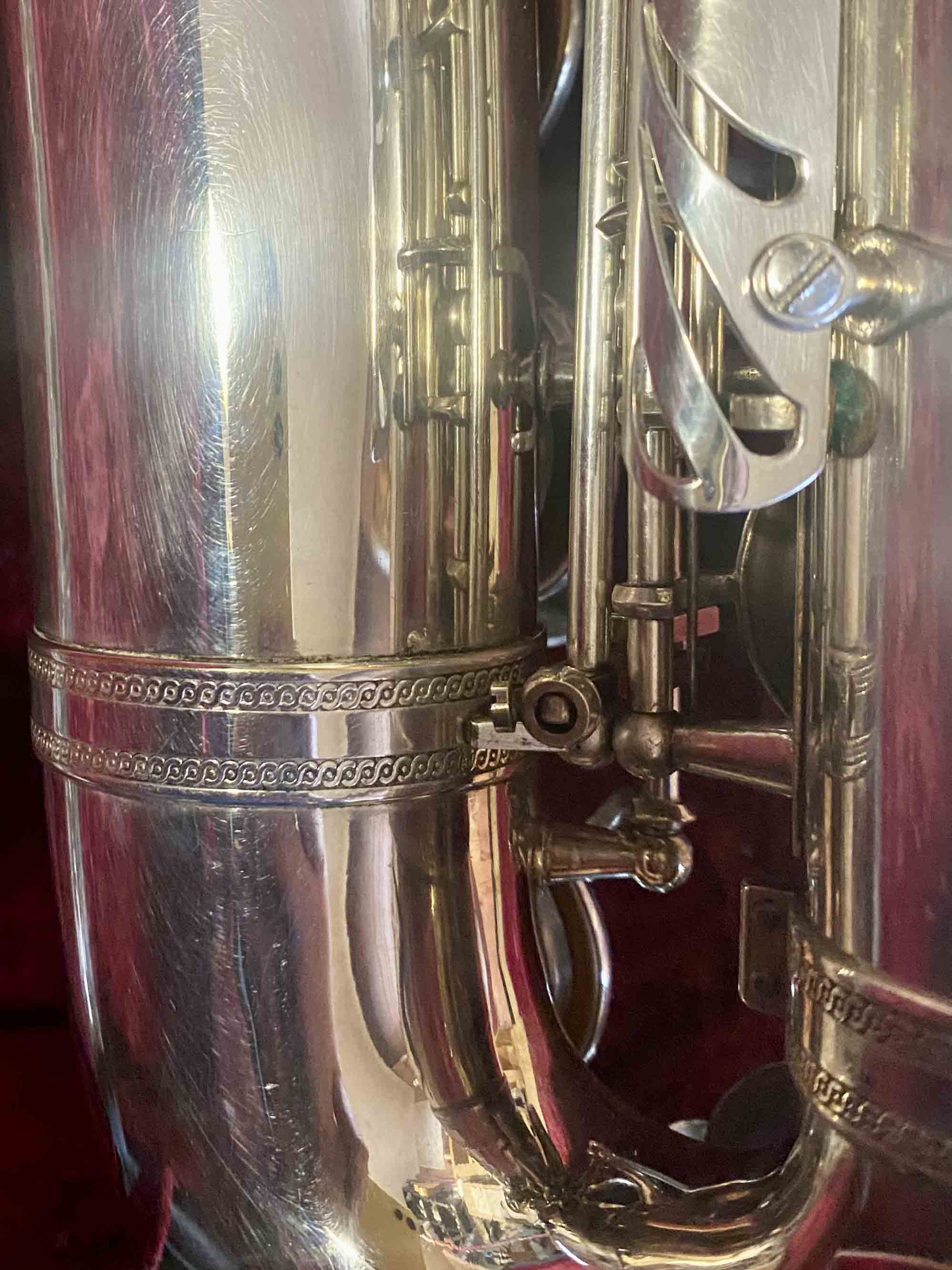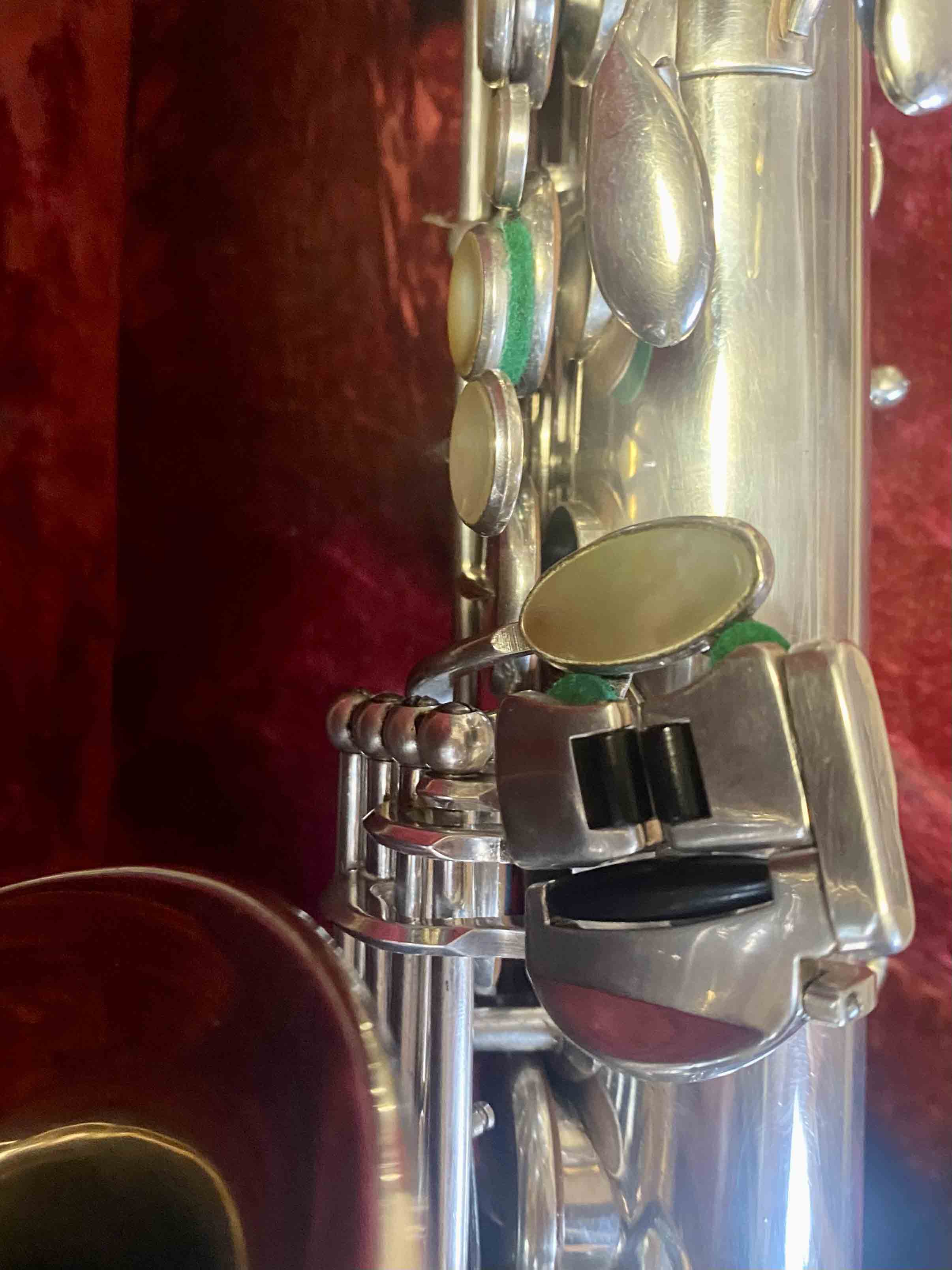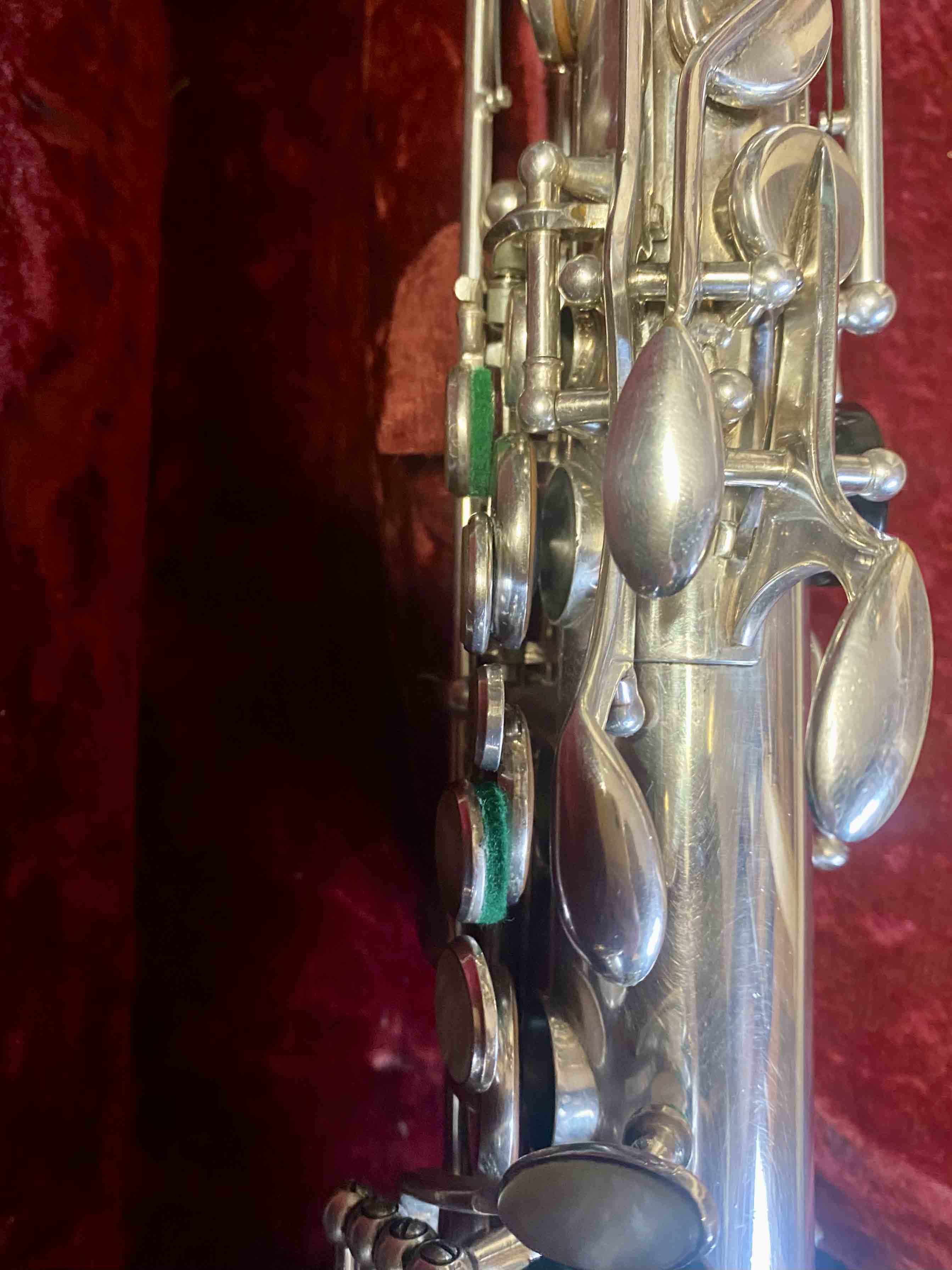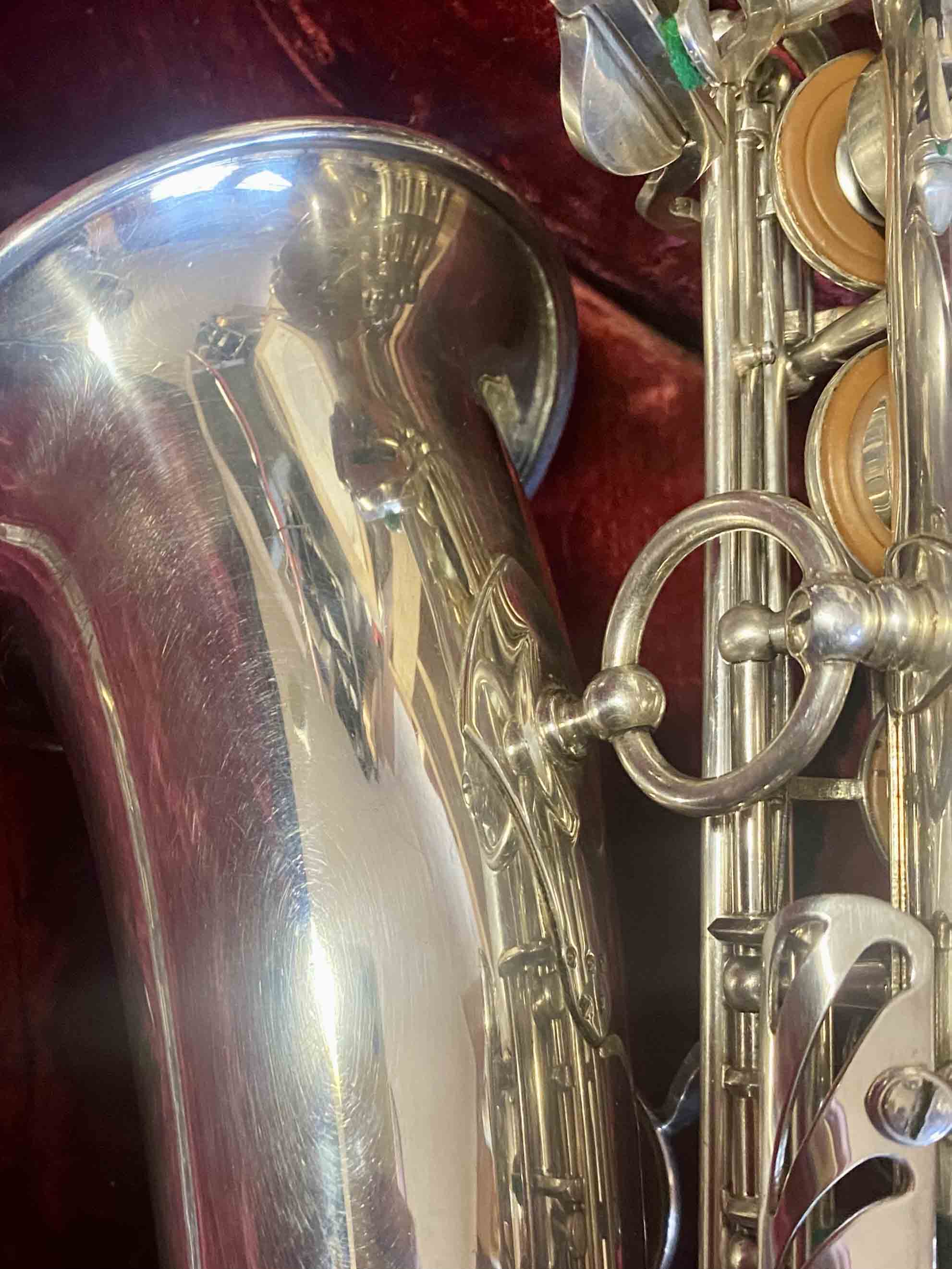 Ce saxophone Selmer Mark VI est en excellent état et a été entièrement remis à neuf avec un nettoyage ultrasons et manuel, un re-tamponnage, des nouveaux lièges et des nouveaux feutres. Il n'a aucun jeu axial ni latéral et est réglé finement pour une qualité de son optimale. La finition est argentée et il est livré avec son étui original.