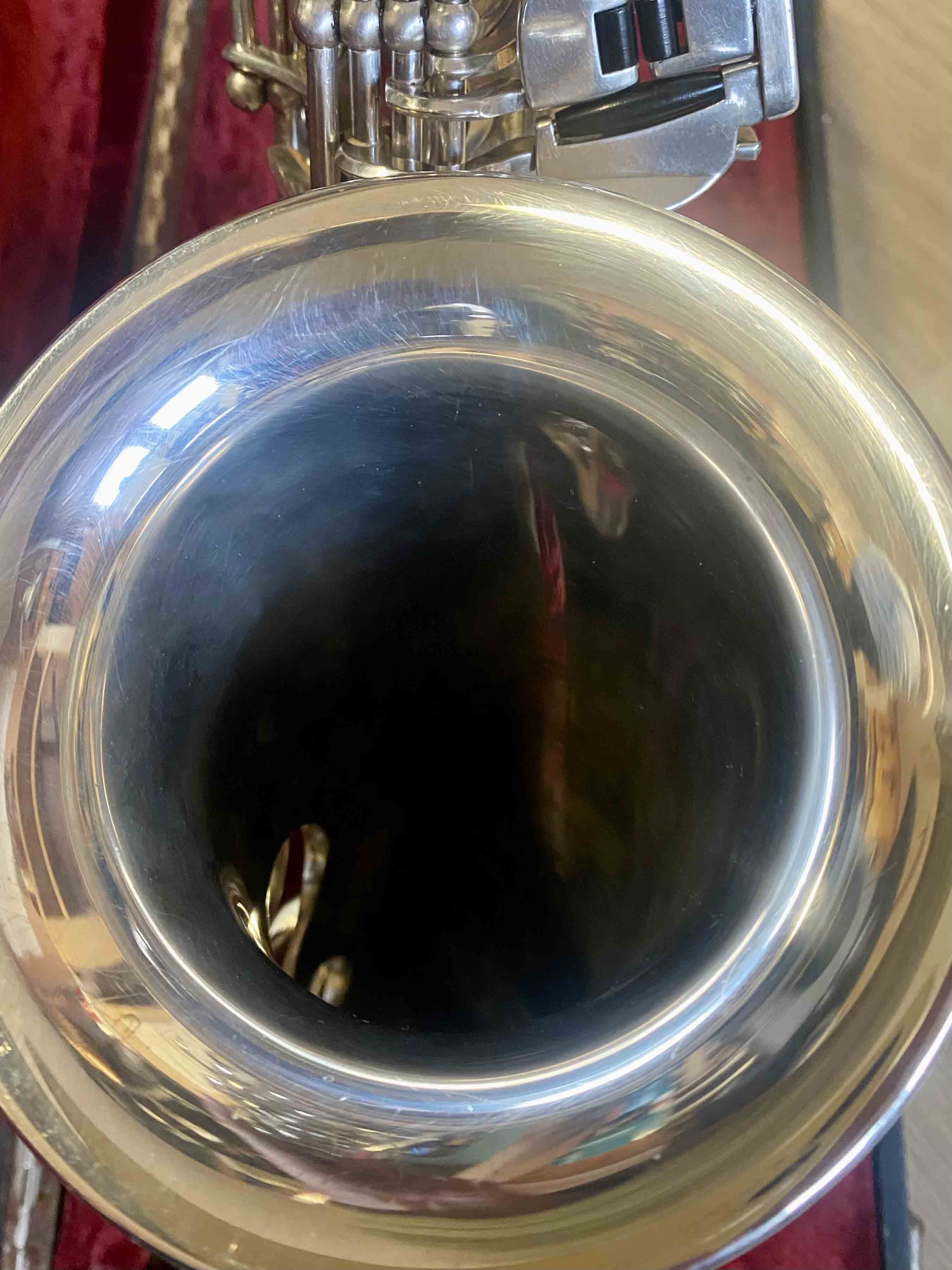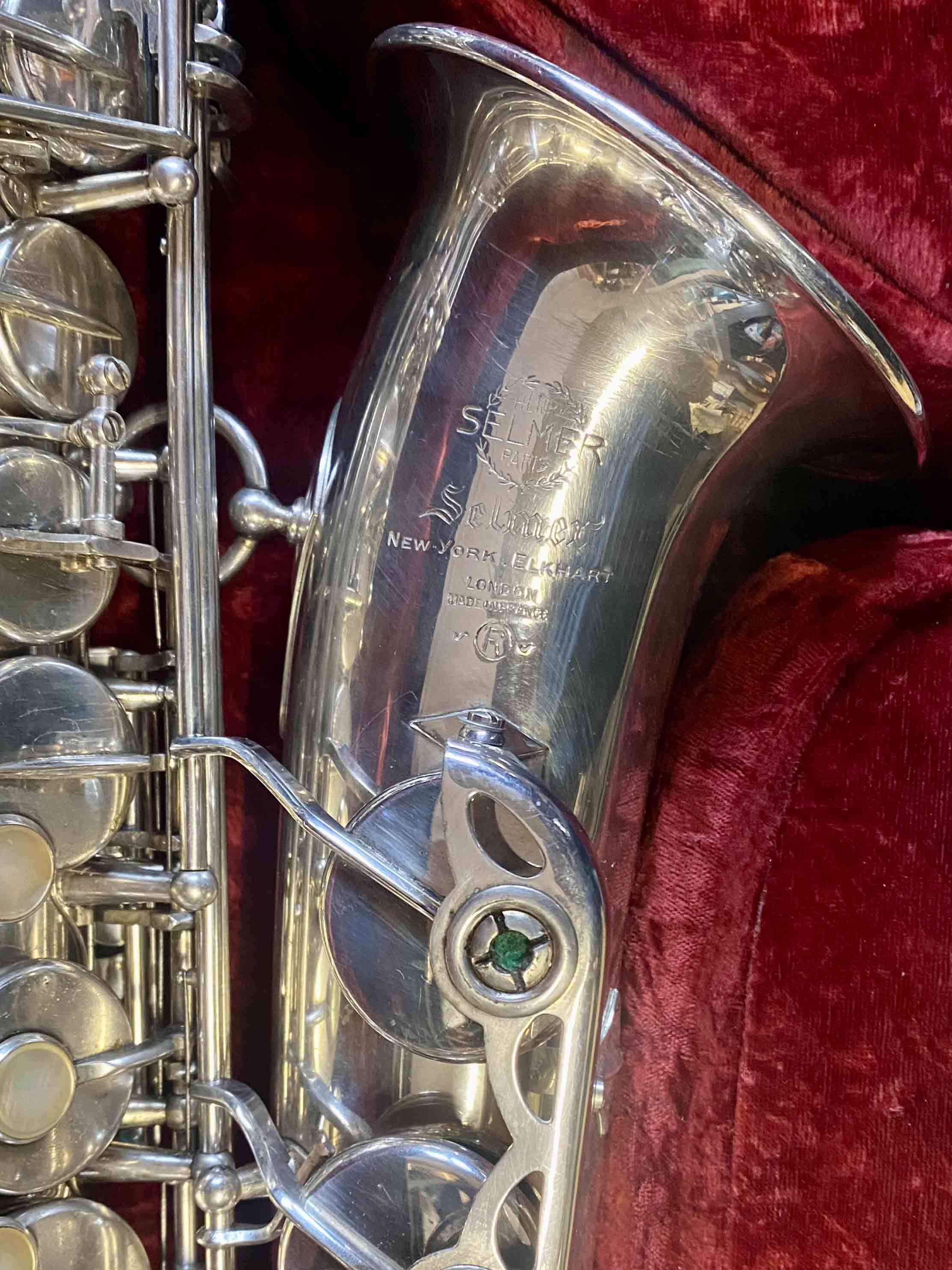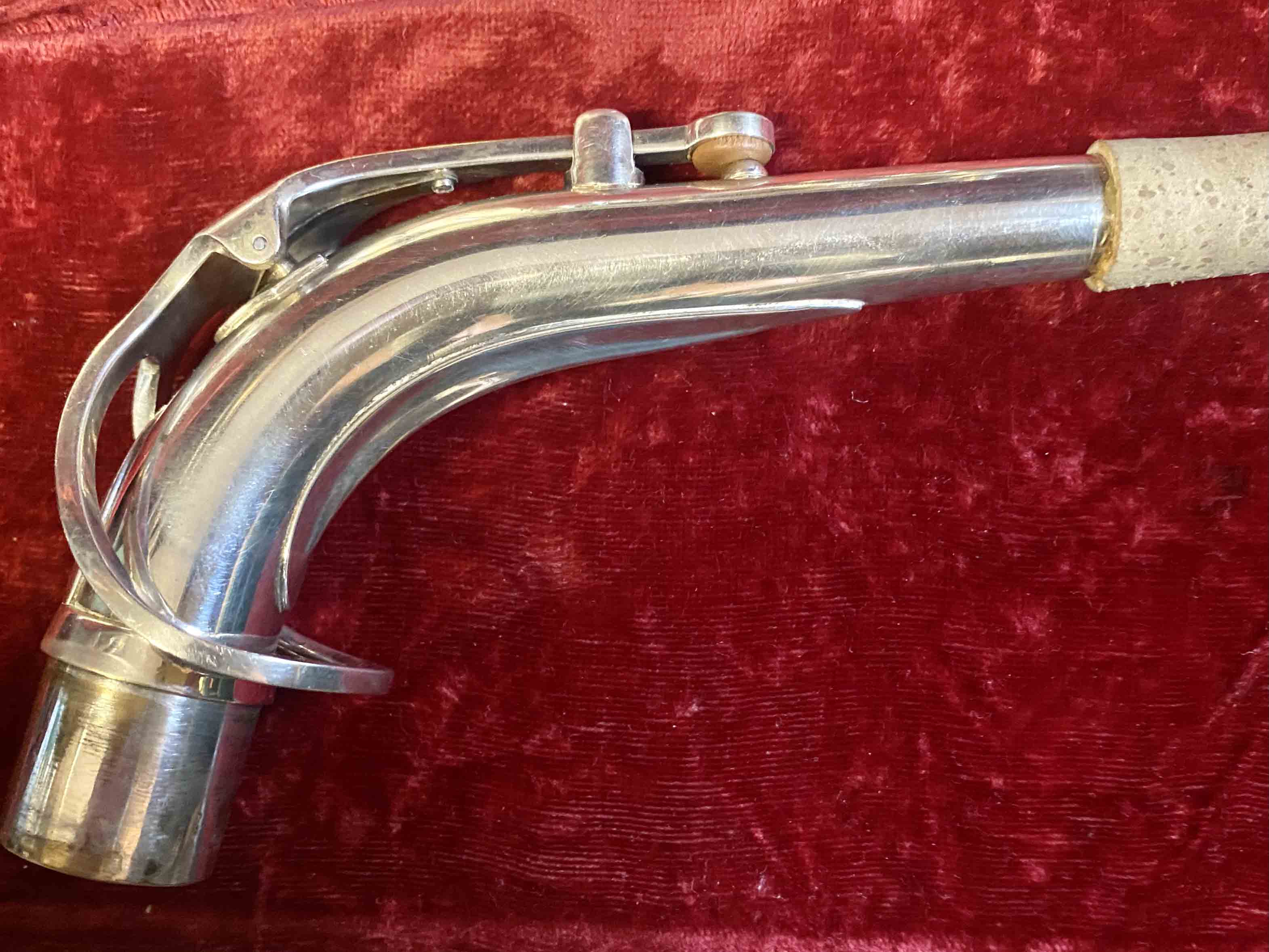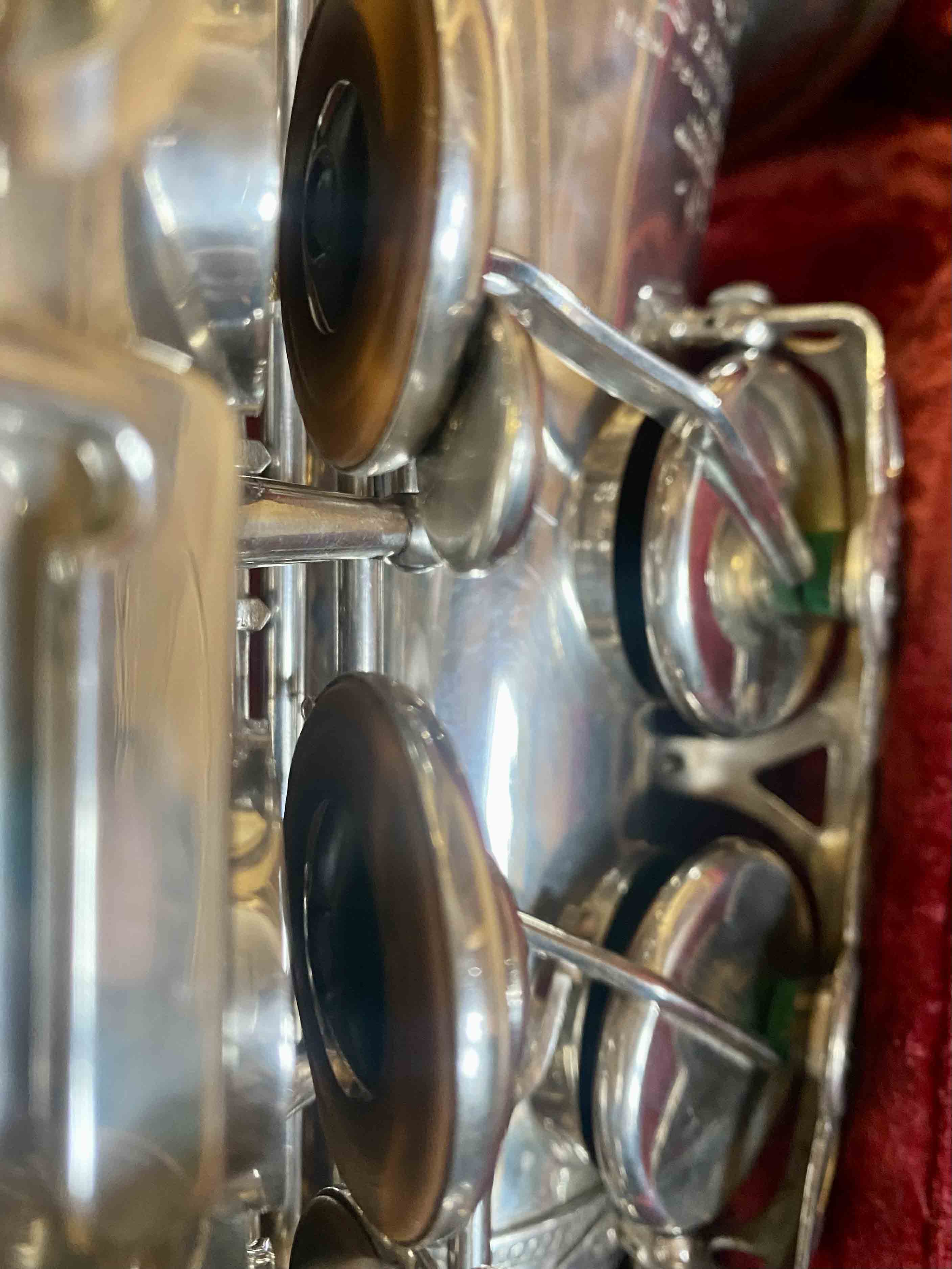 Ce saxophone Selmer Mark VI est en excellent état et a été entièrement remis à neuf avec un nettoyage ultrasons et manuel, un re-tamponnage, des nouveaux lièges et des nouveaux feutres. Il n'a aucun jeu axial ni latéral et est réglé finement pour une qualité de son optimale. La finition est argentée et il est livré avec son étui original.