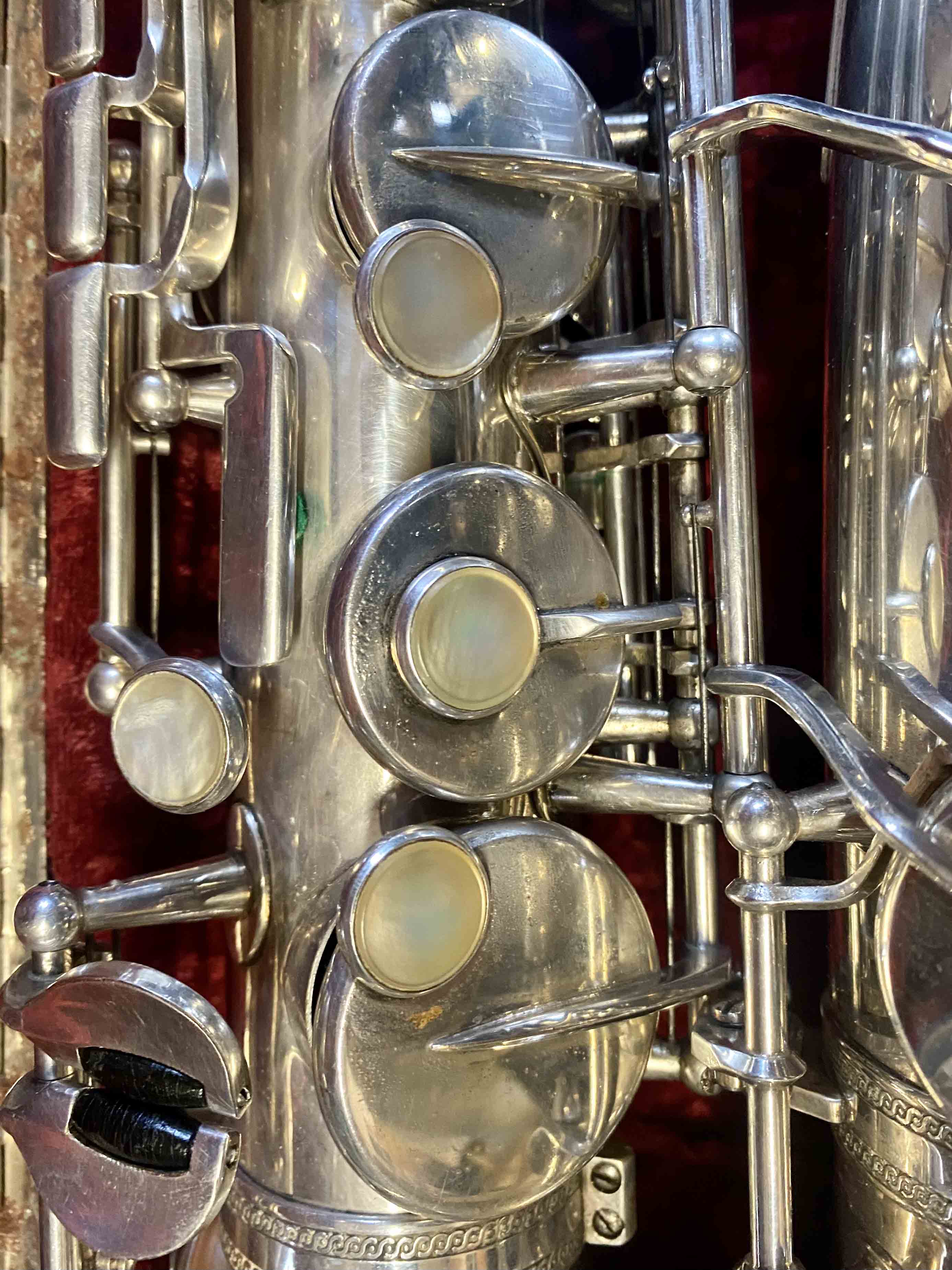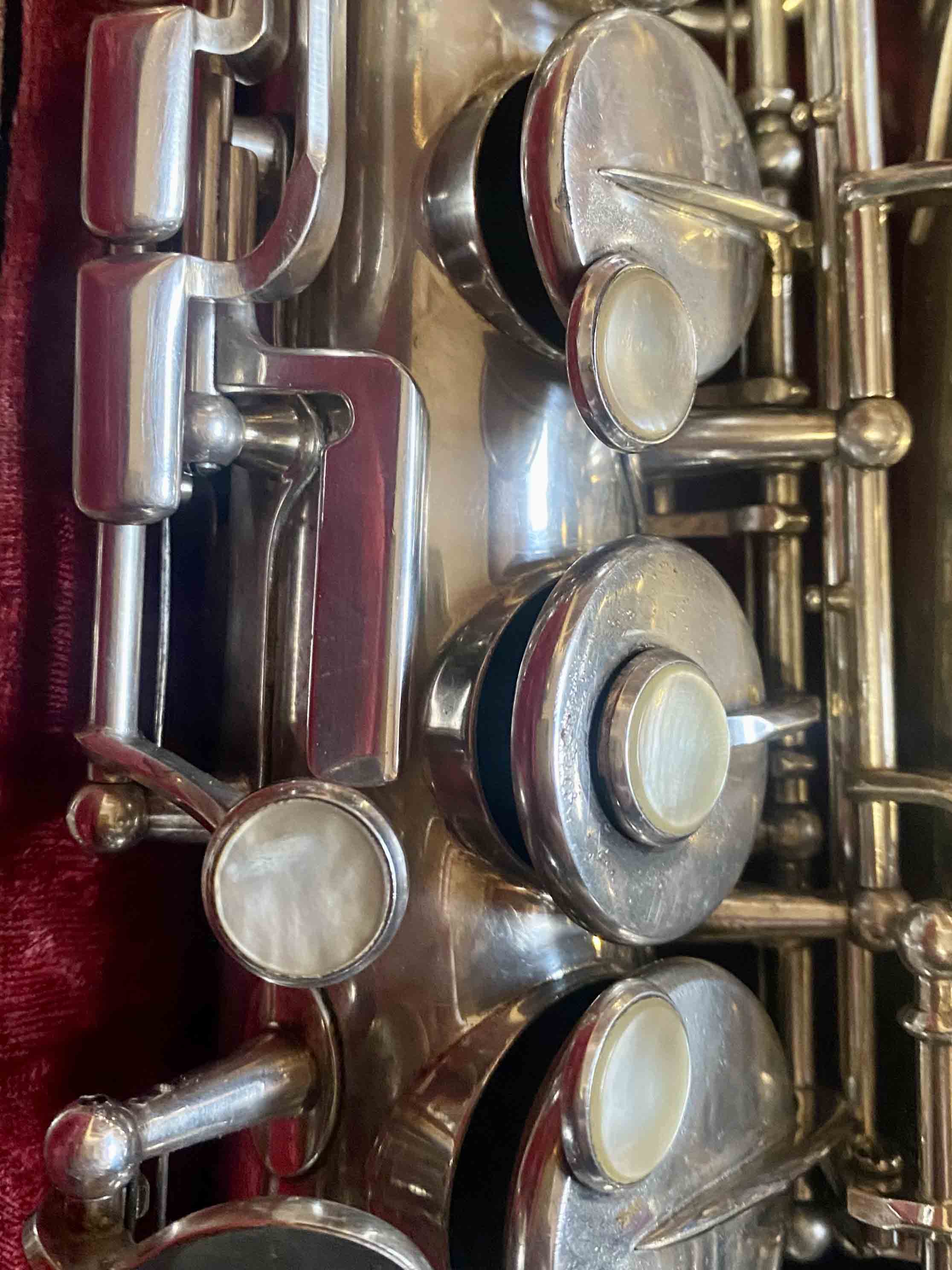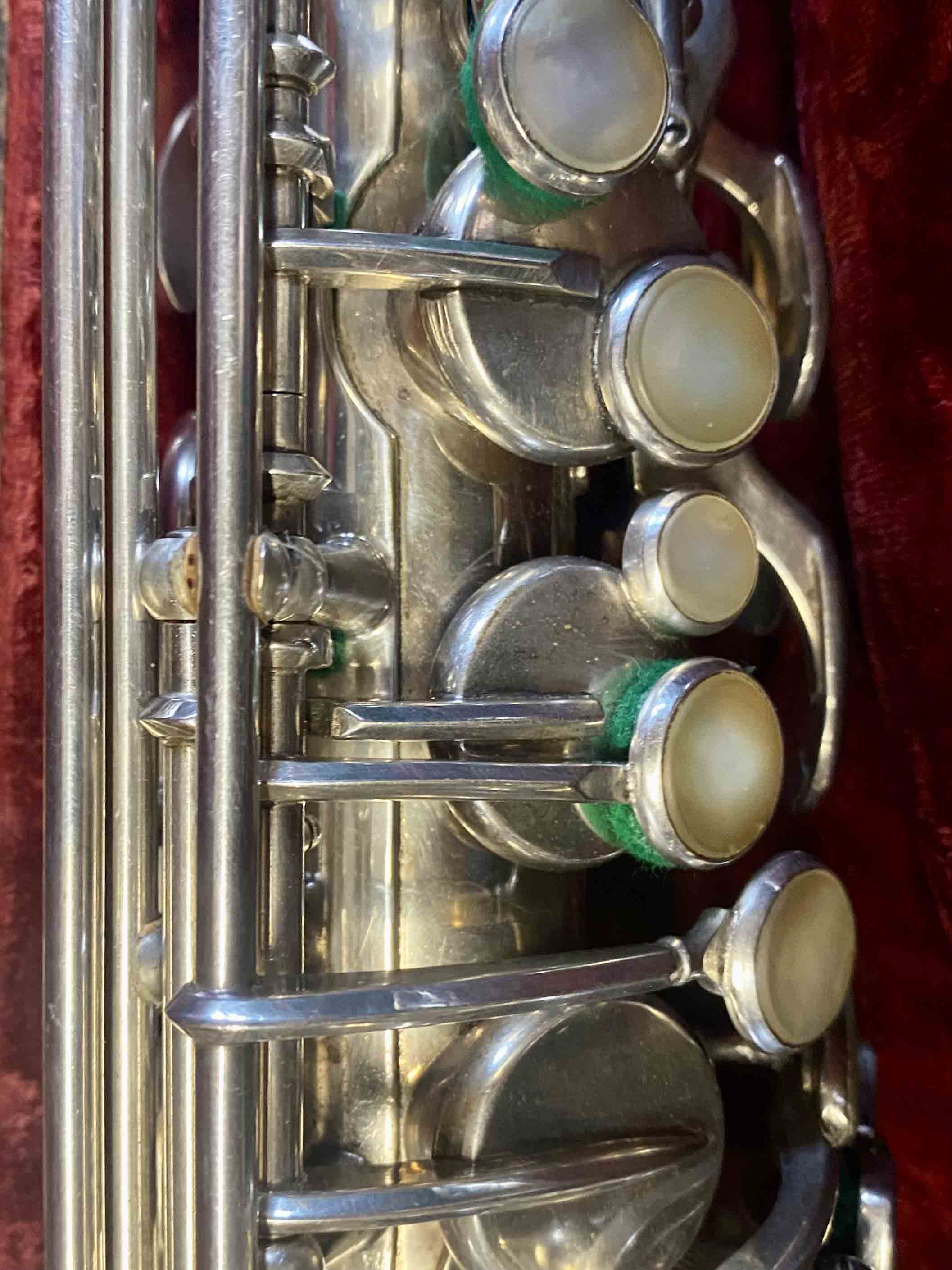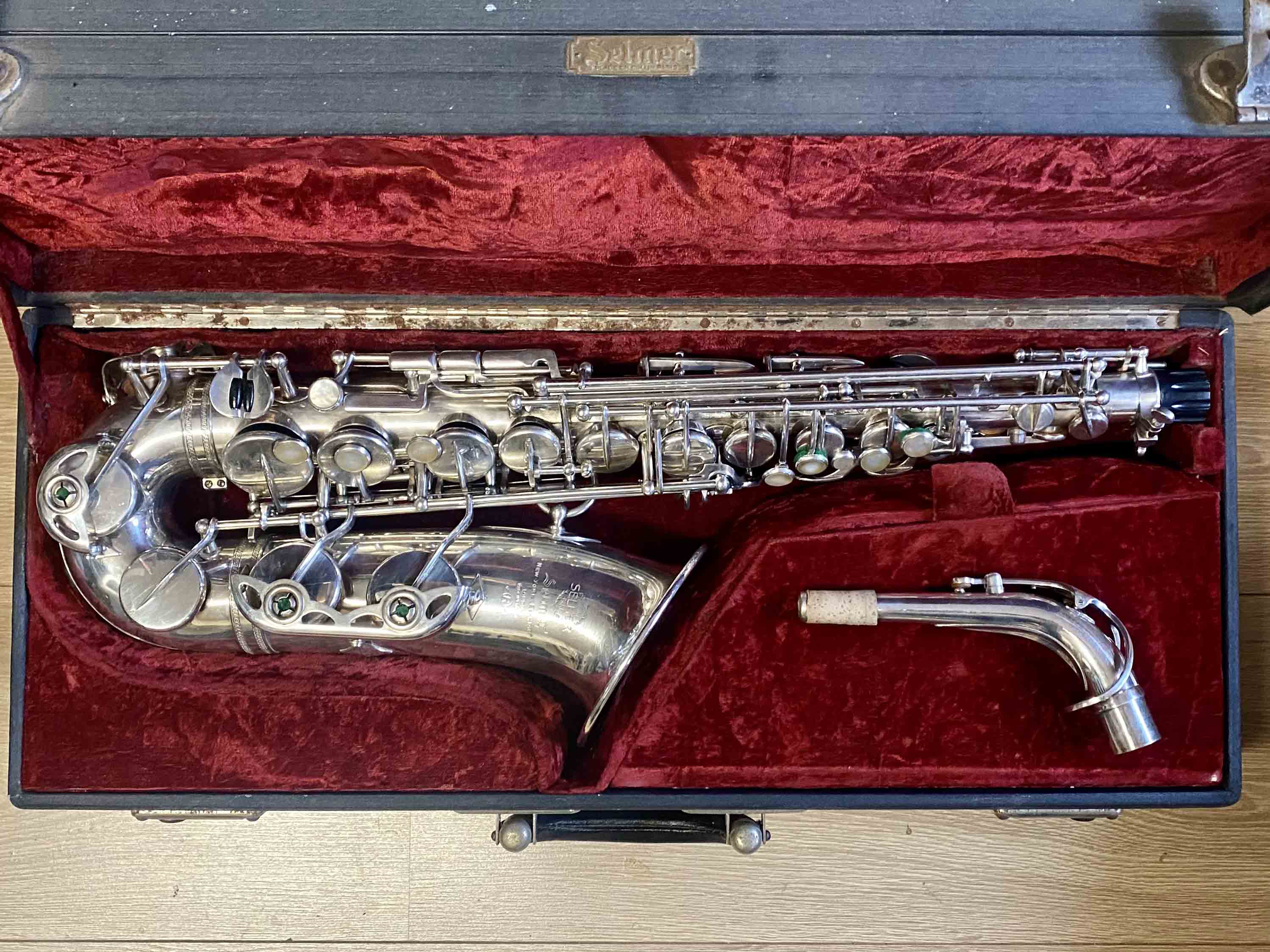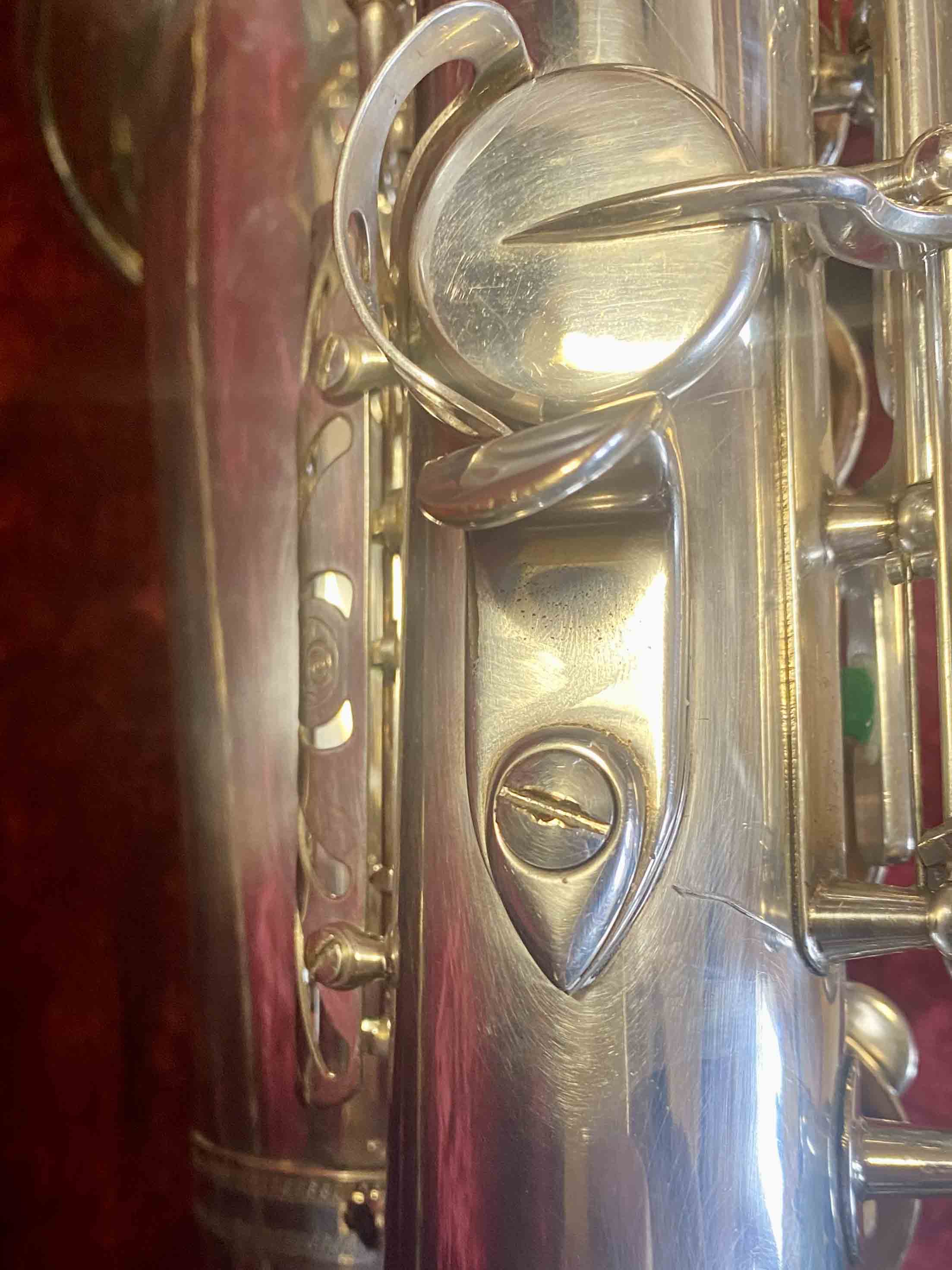 Ce saxophone Selmer Mark VI est en excellent état et a été entièrement remis à neuf avec un nettoyage ultrasons et manuel, un re-tamponnage, des nouveaux lièges et des nouveaux feutres. Il n'a aucun jeu axial ni latéral et est réglé finement pour une qualité de son optimale. La finition est argentée et il est livré avec son étui original.