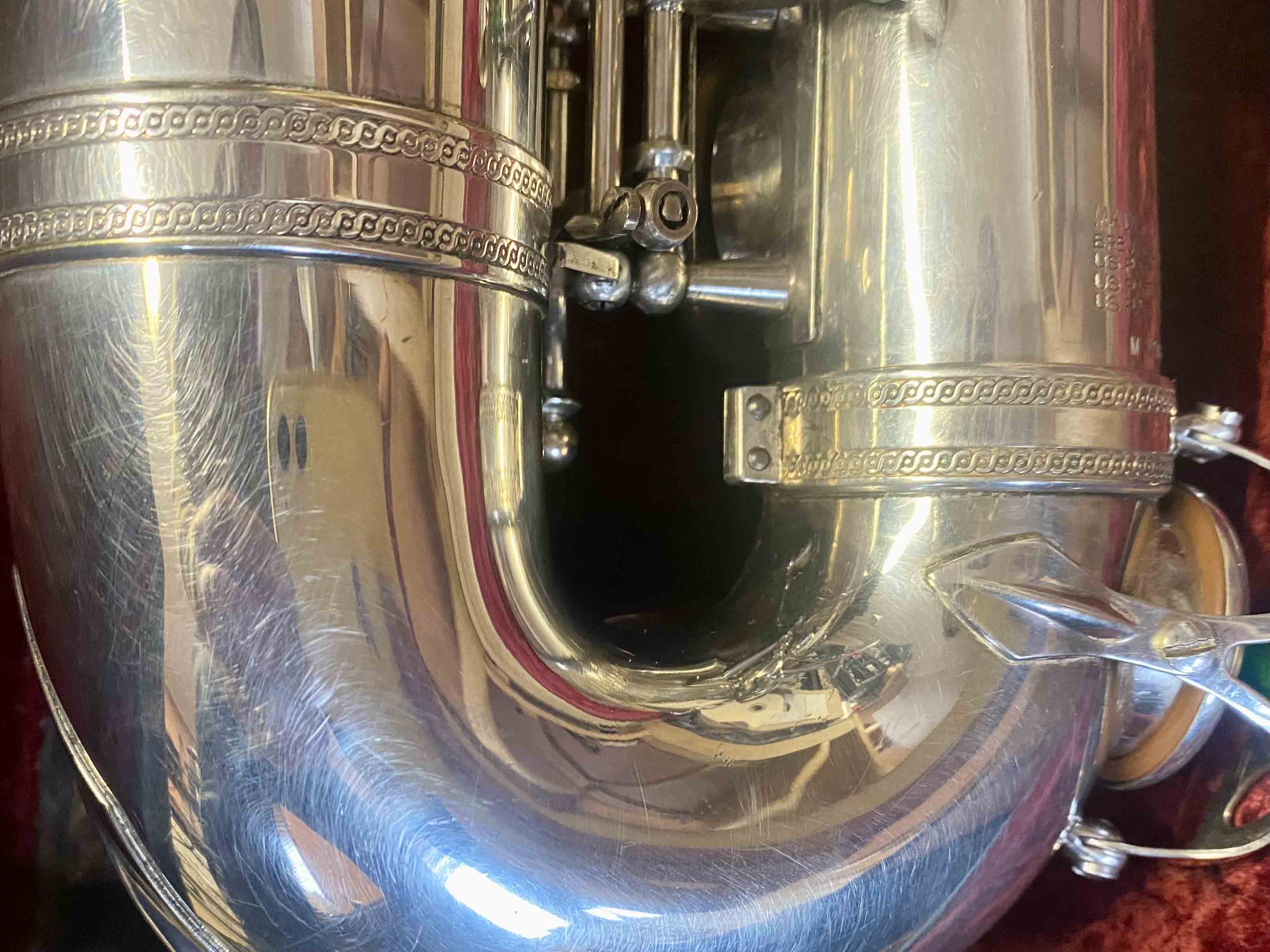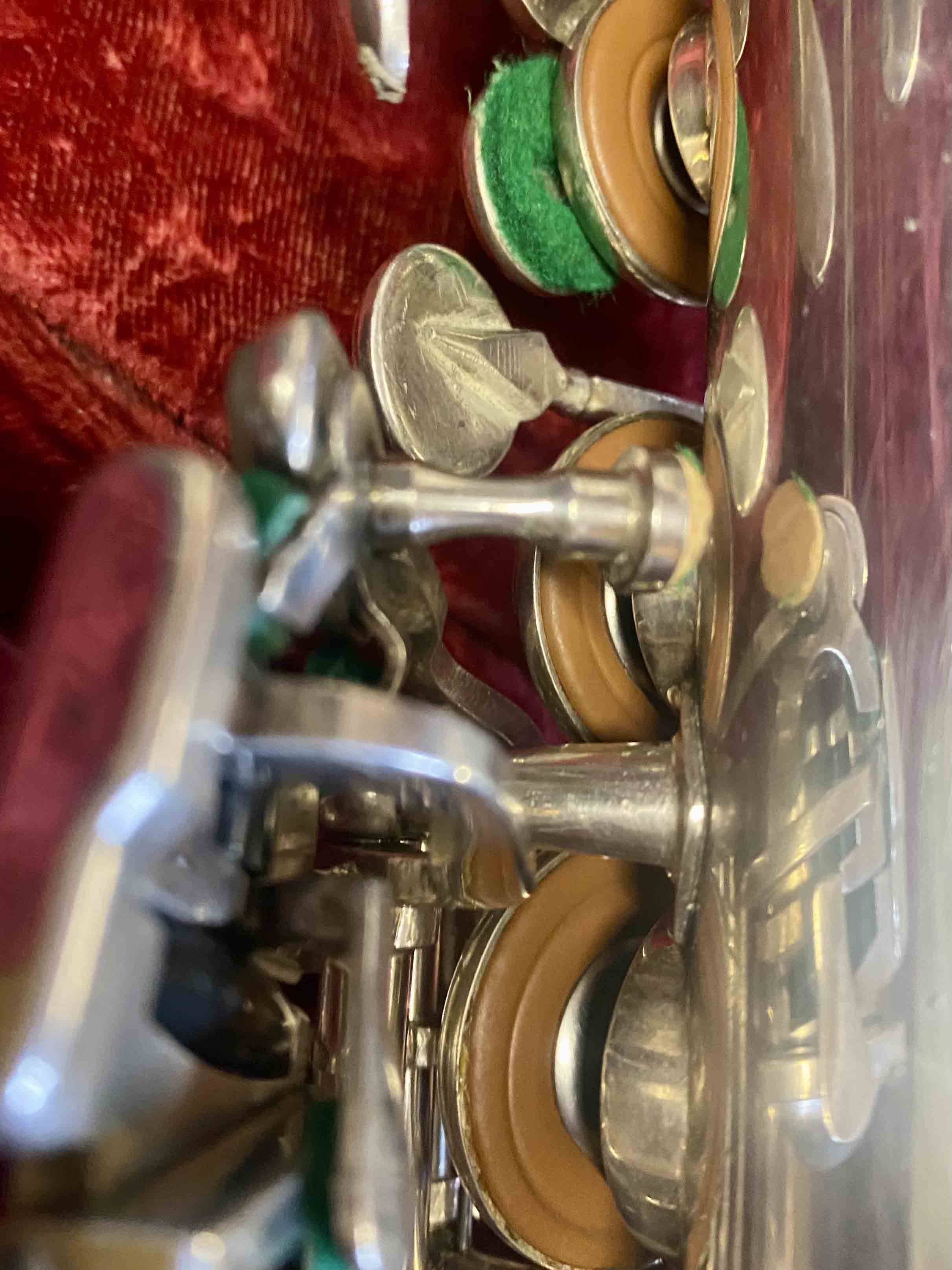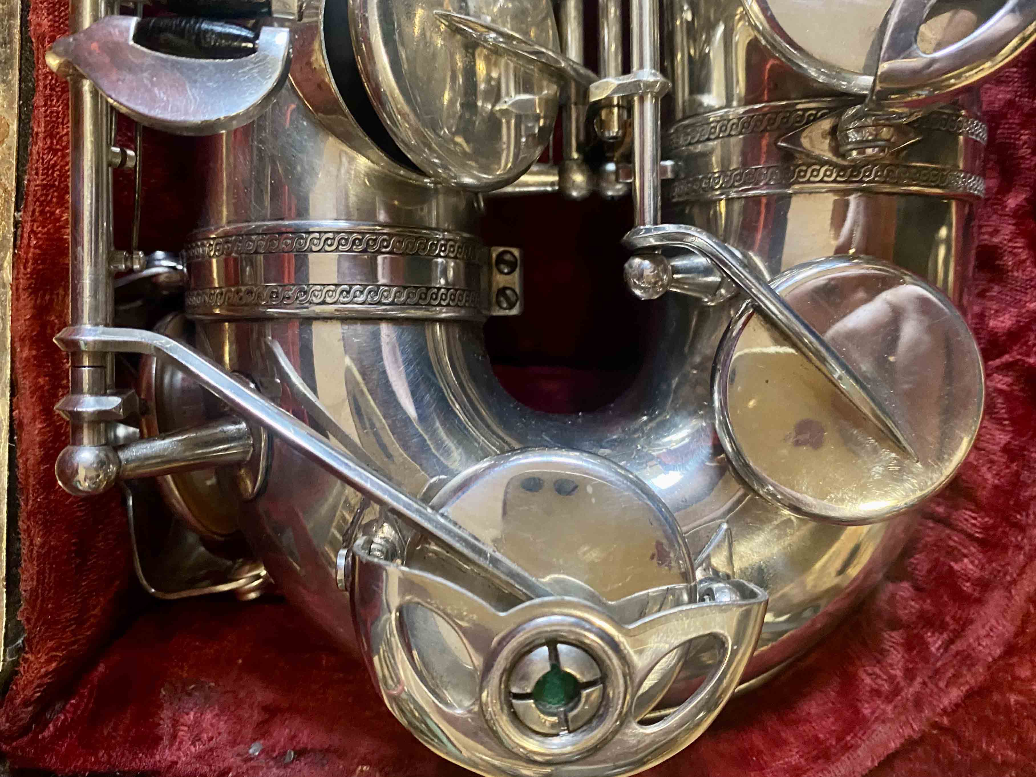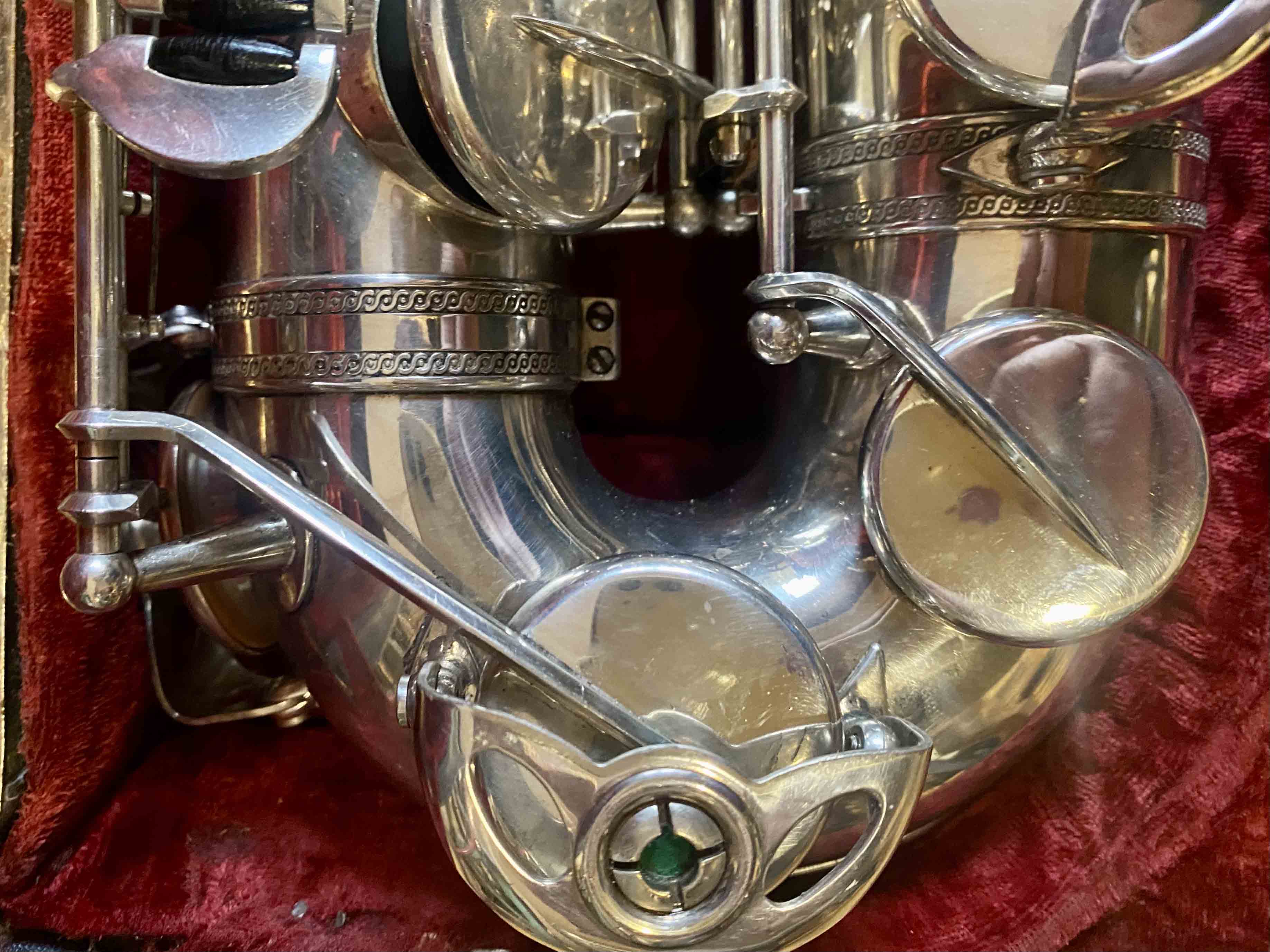 Ce saxophone Selmer Mark VI est en excellent état et a été entièrement remis à neuf avec un nettoyage ultrasons et manuel, un re-tamponnage, des nouveaux lièges et des nouveaux feutres. Il n'a aucun jeu axial ni latéral et est réglé finement pour une qualité de son optimale. La finition est argentée et il est livré avec son étui original.